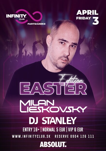 Keď Veľký piatok, tak veľká párty! Skvelá energická noc plná tej najkvalitnejšej elektronickej hudby s lídrom na slovenskej dídžejskej scéne - s MILANOM LIESKOVSKÝM! Nenechajte si újsť veľkonočnú edíciu s MILANOM LIESKOVSKÝM, spolu s ním výborný support DJ STANLEY!